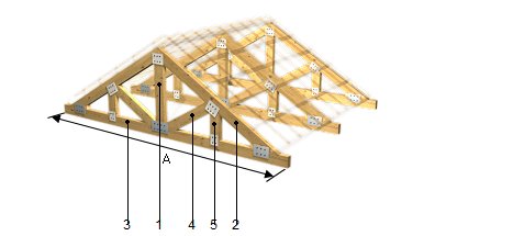 Armado de gran escuadría de 8 m de claro, pendiente 30%, formada por elementos de madera aserrada de pino, de 75x230 mm de sección, con acabado cepillado; conexiones con herrajes de acero galvanizado tipo DX51D+Z275N y tornillos rosca-metal de acero cincado, para ensamble de estructuras de madera; separación entre armados hasta 5 m. | ||
